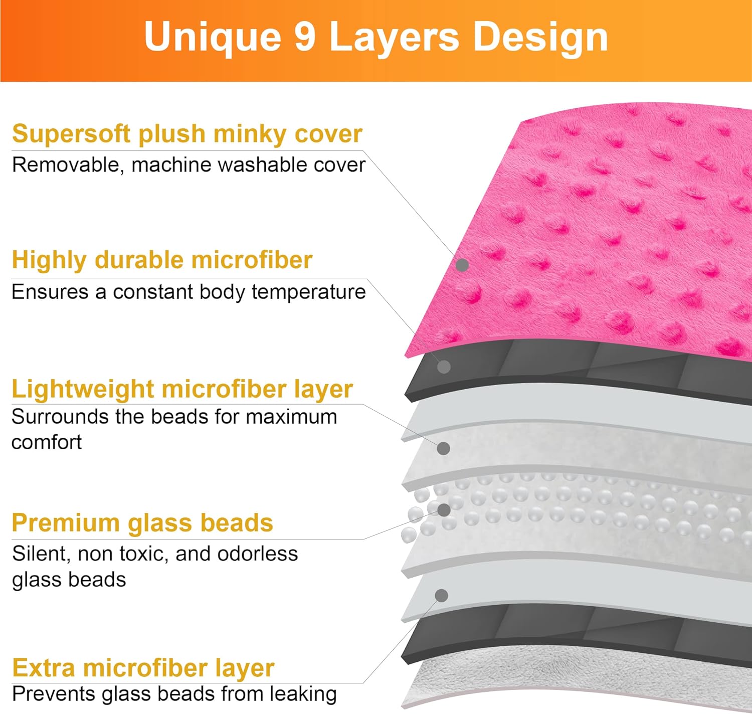 - SUPER SOFT WEIGHTED BLANKET - Our Hazli weighted blanket is designed with 9 layers and 10’’ pockets for better weight distribution and maximum comfort. It is made of breathable cotton and filled with silent micro glass beads. The beads are evenly distributed in each individual pocket, so they do not move around and help the weighted blanket to shape and adapt to your body.