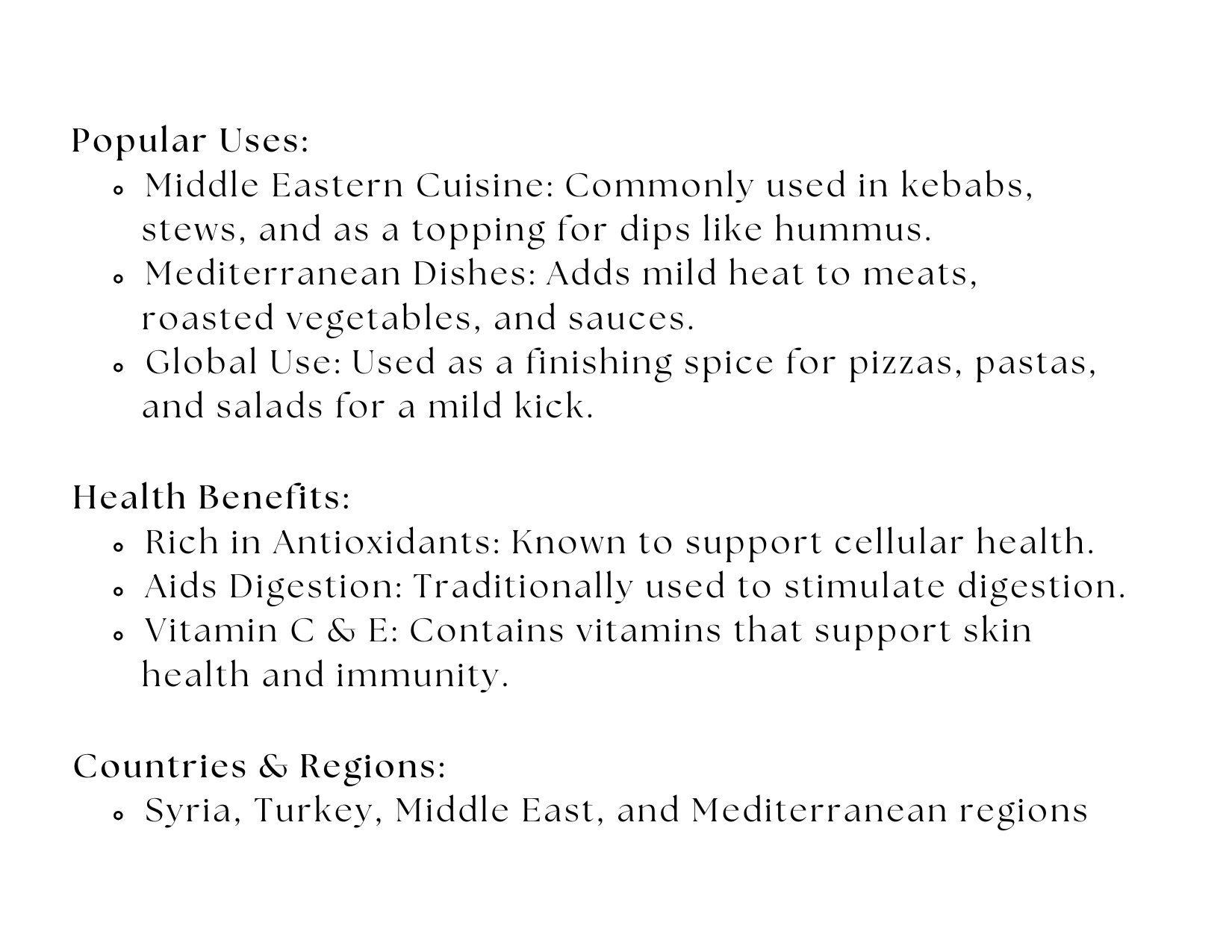 Aleppo Pepper is a coarsely ground, deep red chili with a mild heat and fruity, slightly tangy flavor.