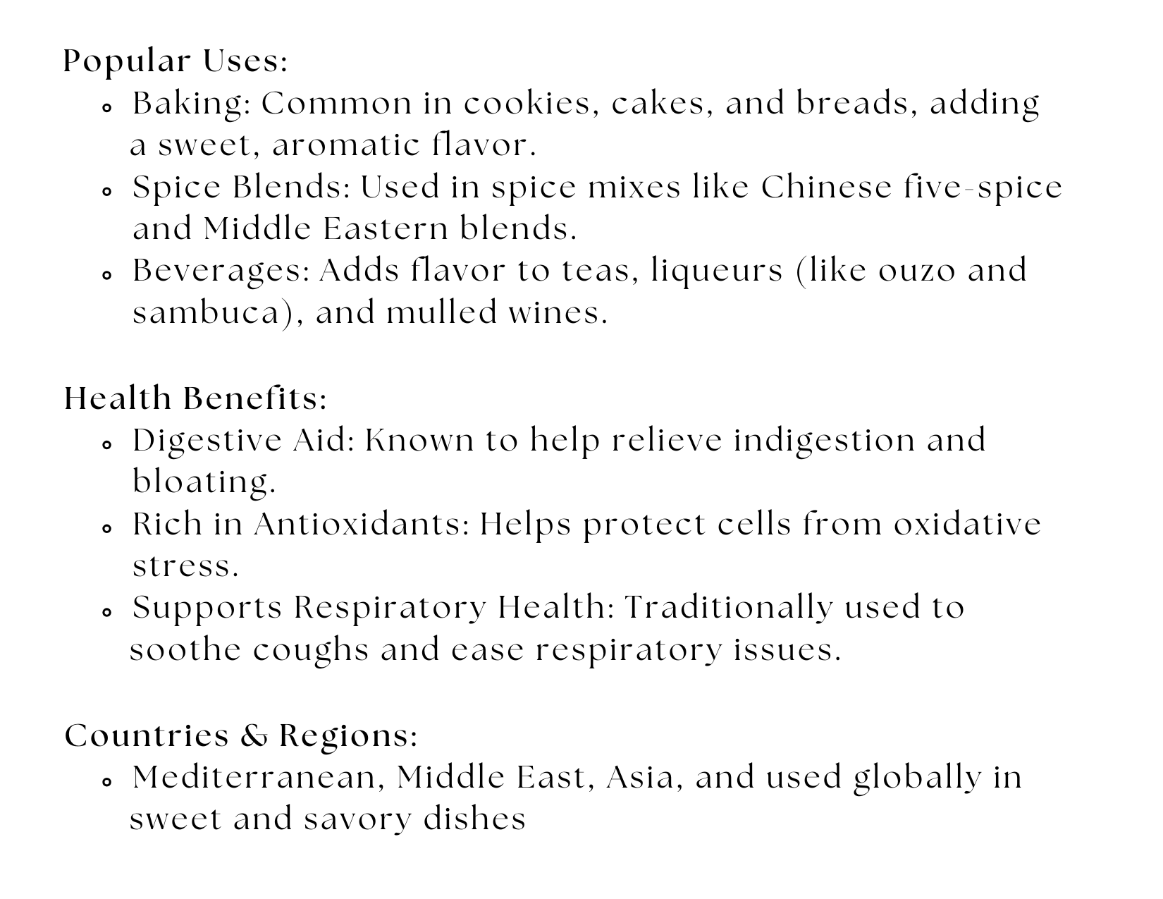 Anise seeds have a sweet, licorice-like flavor with earthy undertones.