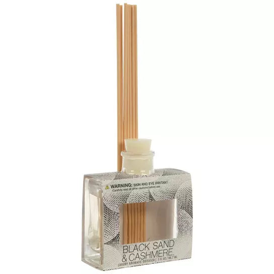 Enjoy the warm and inviting scent of this Black Sand & Cashmere Aromatic Diffuser. This diffuser features clean notes of pear, red berries, sea salt, orange blossom, iris, orchid, and undertones of sandalwood and marine. Simply remove the rubber stopper and place the reeds into the bottle. The reeds will naturally draw the fragrance oil up, diffusing it into the air. Create a relaxing and serene environment with this diffuser.