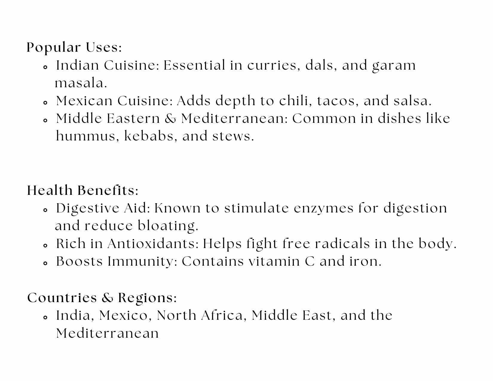 Cumin is a warm, earthy spice with a slightly bitter nutty taste.