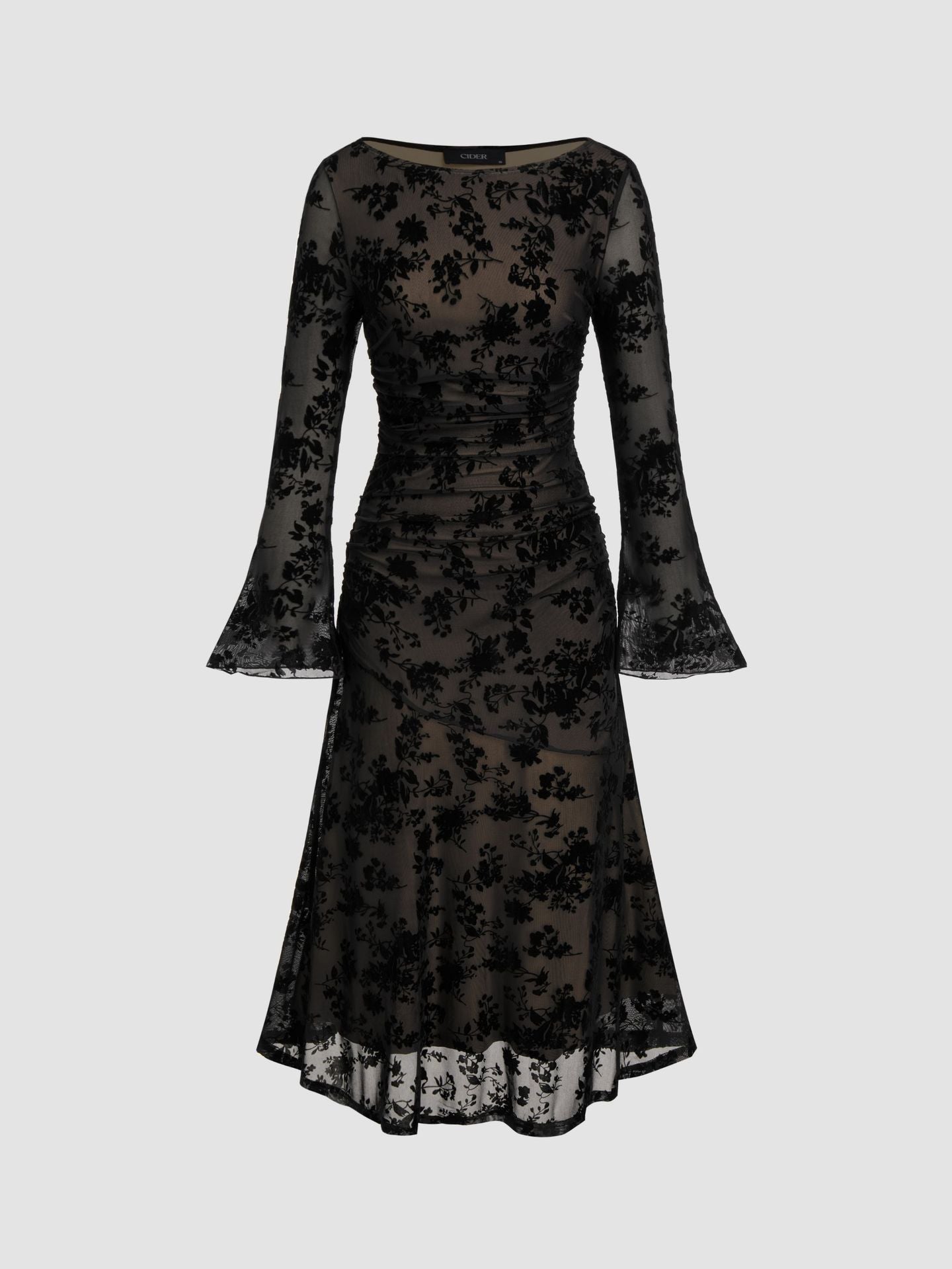 A sophisticated midi dress with a floral burnout pattern. The crew neck and long sleeves make it perfect for transitional weather, offering a blend of coverage and allure.