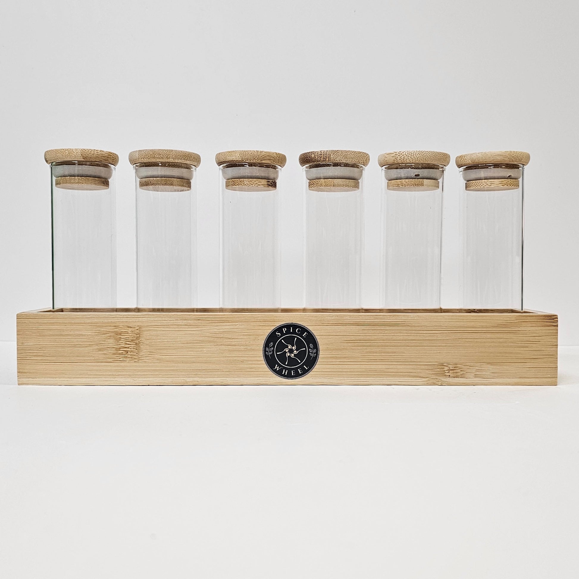 Elegant glass jars with bamboo lids, all neatly organized in a stylish bamboo box. Perfect for displaying on your countertop! - Does not come with spices. Product size is 5.75" tall and 11.75" long.