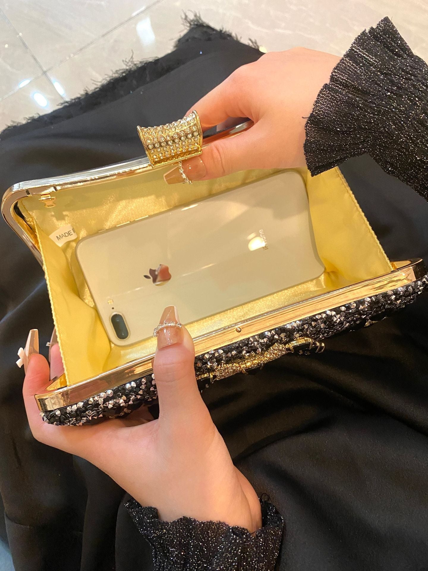 This shiny dinner clutch is textured with metallic handles embellished with several black diamonds