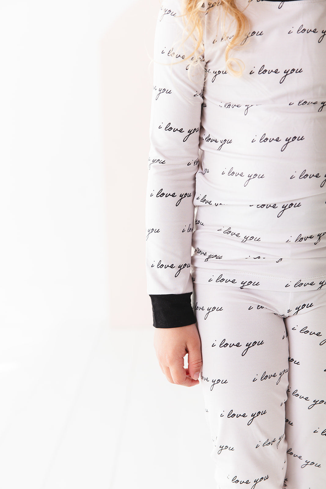 Our softest, coziest, Spunky Sparrow Kids jammies are here in an all new print... "I love you"! Made of bamboo viscose, these are sure to keep your little loves snuggly and in style. They are 240gsm and tables inside for the ultimate comfort. This is the perfect gender neutral print for those parents that love matching their little ones together.