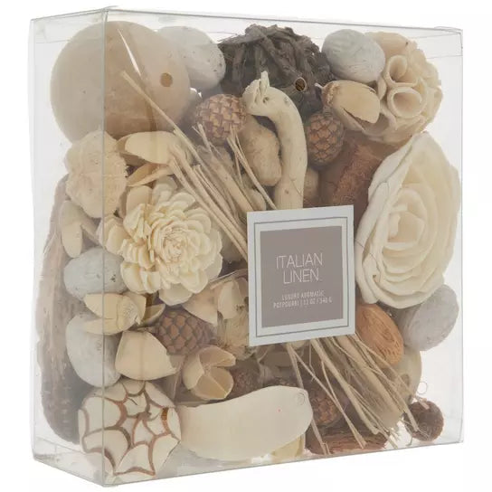Freshen up your home with the clean scent provided by this Italian Linen Potpourri. This box contains different accents like faux flowers, reeds, and acorns scented like crisp Italian linens. Use this potpourri to invigorate your bathroom, laundry room, and elsewhere in your home!