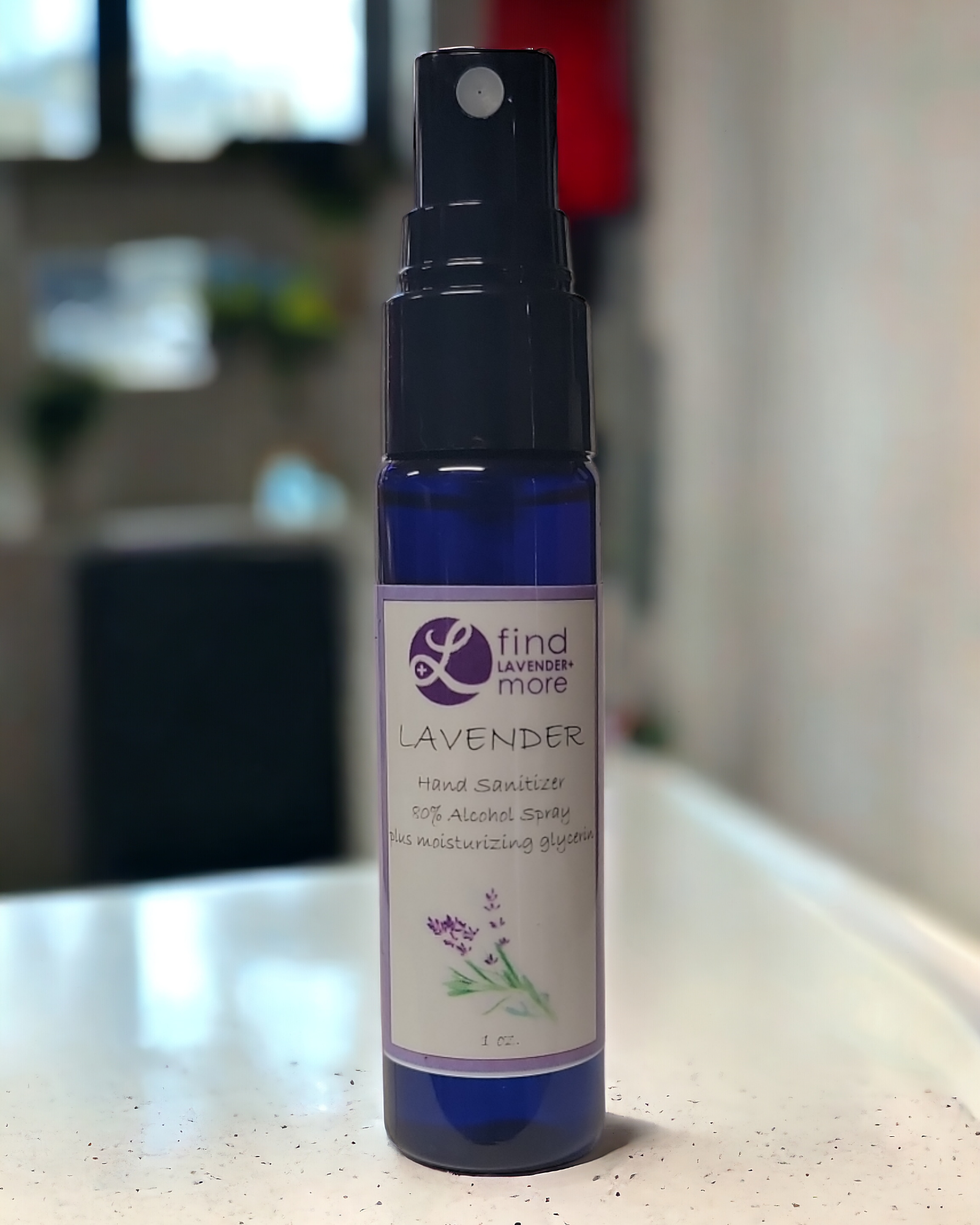 - 1 oz. 80% Alcohol spray Lavender Hand sanitizer with moisturizing glycerin