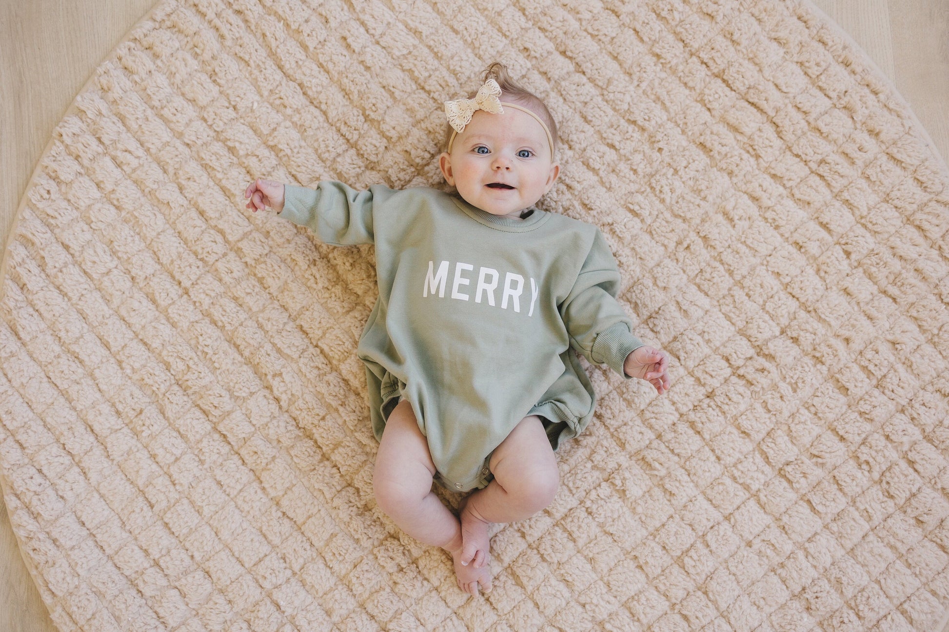 Merry graphic oversized sweatshirt romper with snaps at crotch. Lightweight terry material.