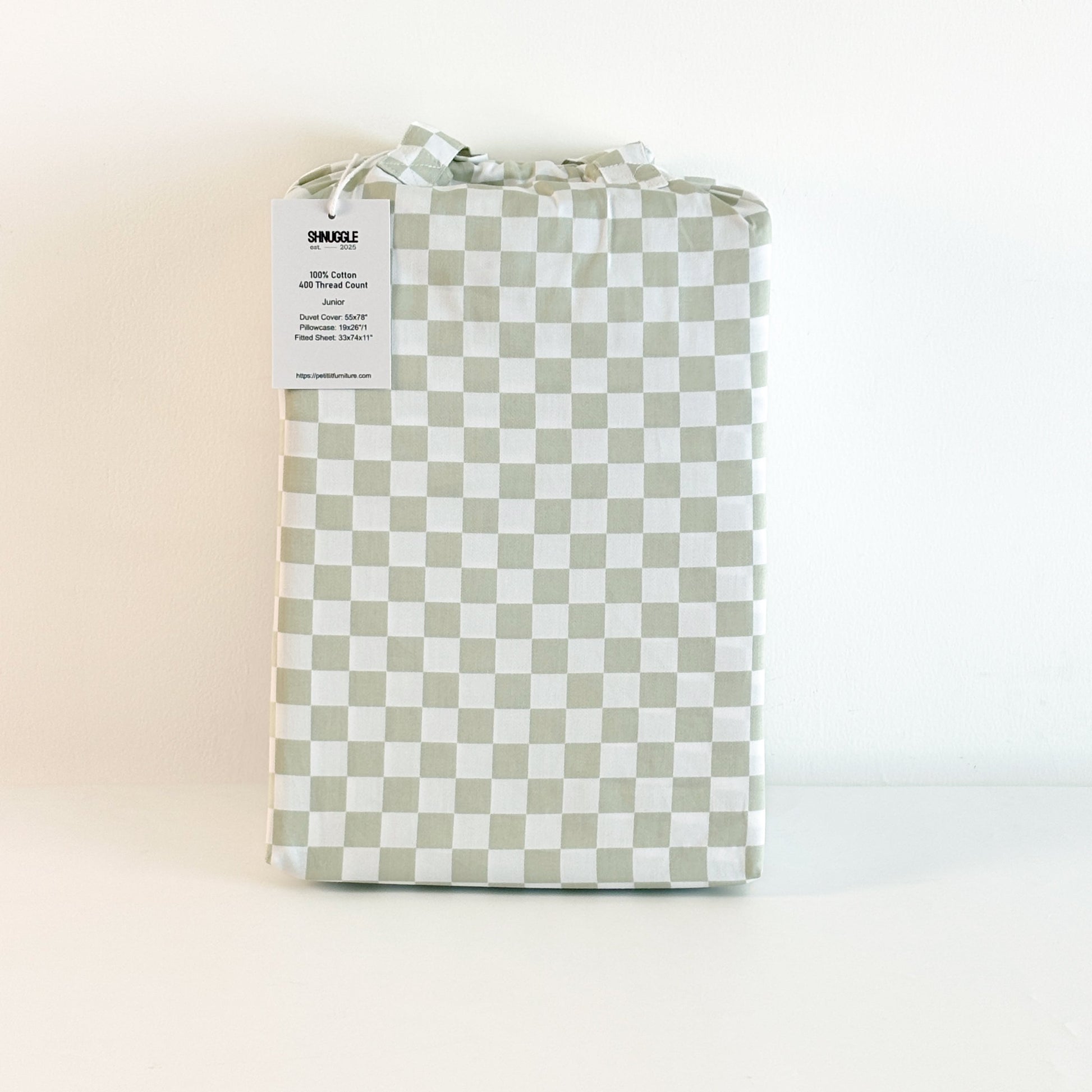 Transform bedtime into a breeze with the SHNUGGLE Bedding Set in Sage Checker! Its clever snaps keep the duvet cover snugly attached to the quilt, making linen changes a snap—literally. Made from soft, wrinkle-resistant 400-thread-count cotton with zero chemical finishes or dyes, it’s as gentle on your skin as it is easy to care for. Wash, dry, and pop it right back on the bed for cozy comfort that’s always ready to roll!