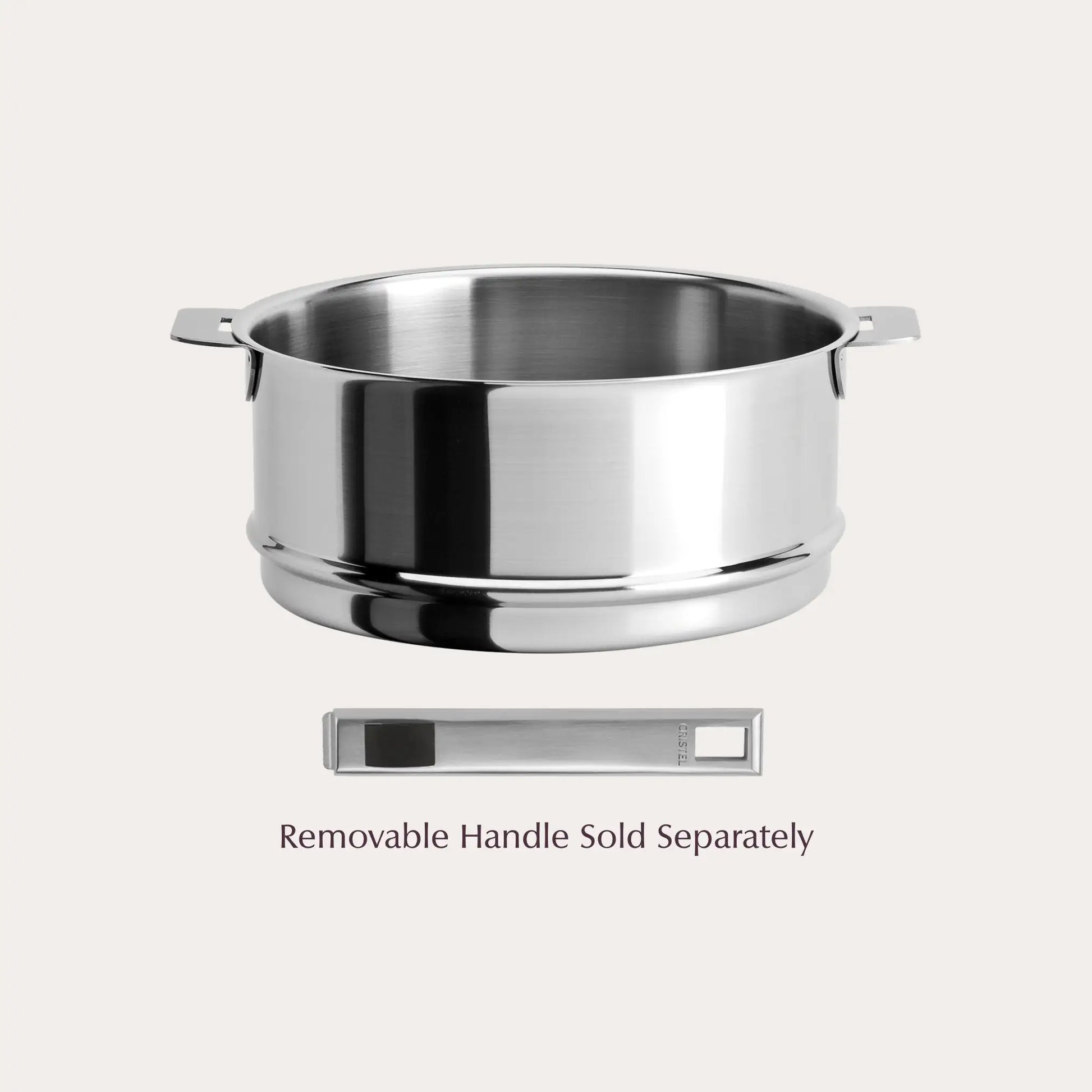Stainless steel Steamer insert, brushed finish, detachable handle. The stainless steel steamer is available in 2 sizes: 1 qt (5.5” diameter) and 6.5 qt (10” diameter).