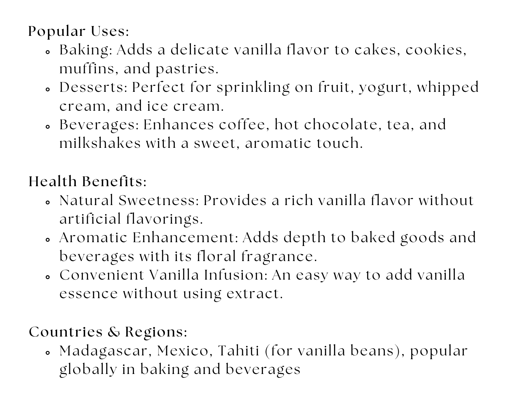 Vanilla sugar is granulated sugar infused with natural vanilla beans, giving it a sweet floral aroma and rich vanilla flavor.