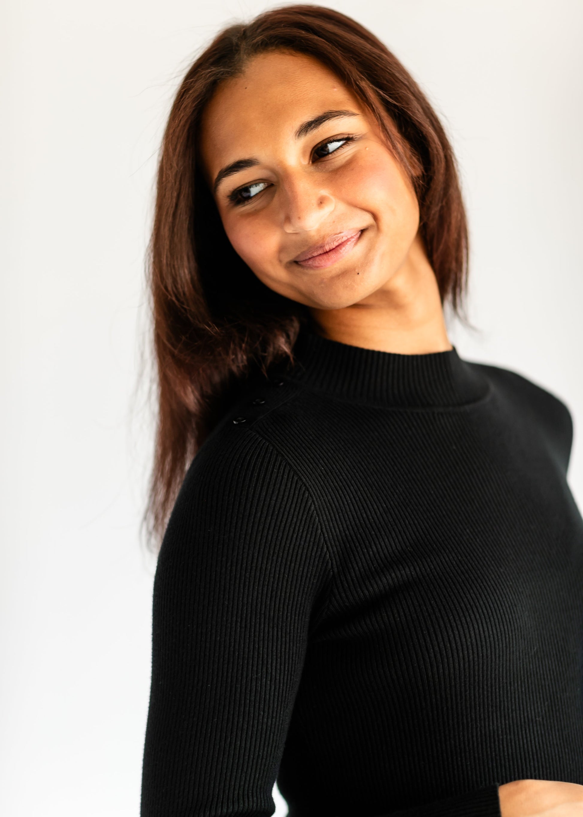 The Vanna Ribbed Knit Midi Dress is a comfortable and modest ribbed knit dress. This great layering basic will make you feel confident and covered. It features a high mockneck, long sleeves, and buttons on the shoulder for an elevated detail. Designed with a modest straight-fit, and material is thick enough to hide any lines. The midi length and neutral color pairs perfectly with chunky boots and shackets!